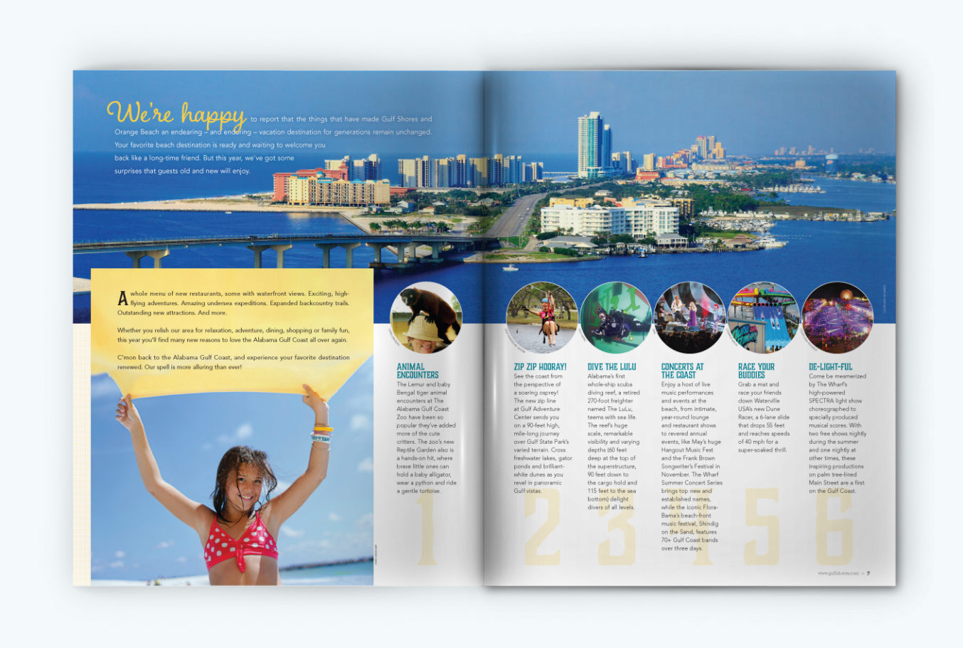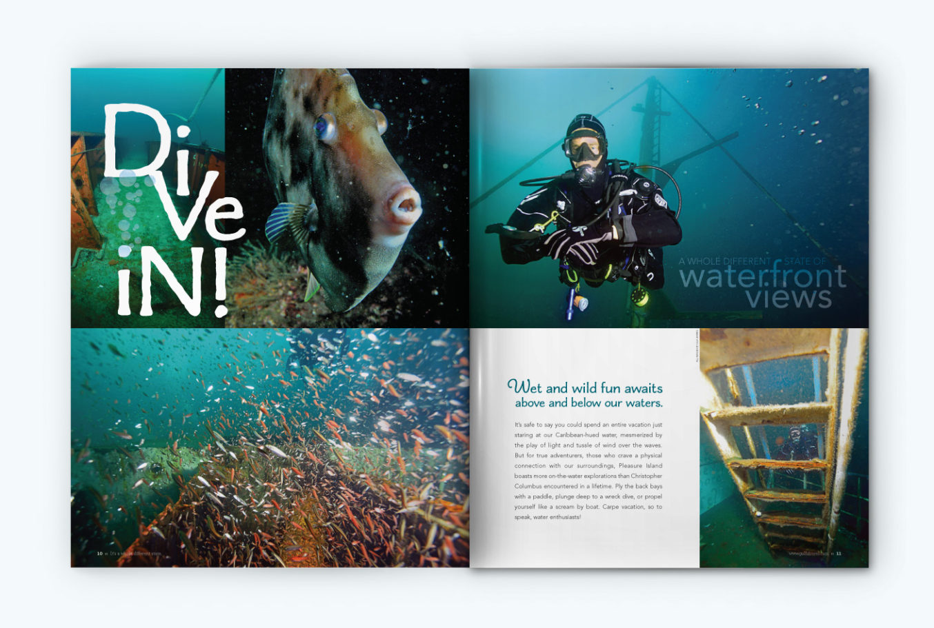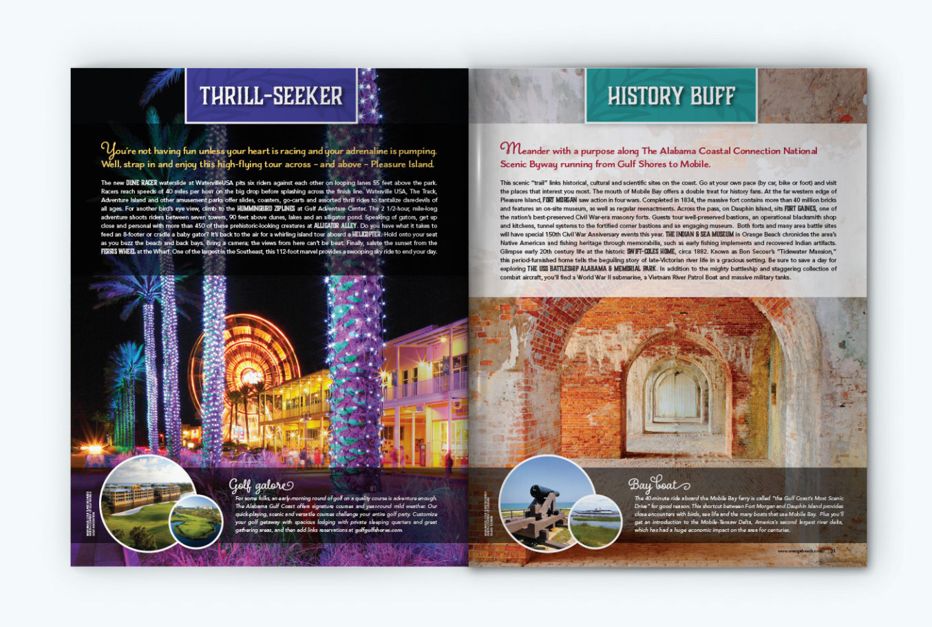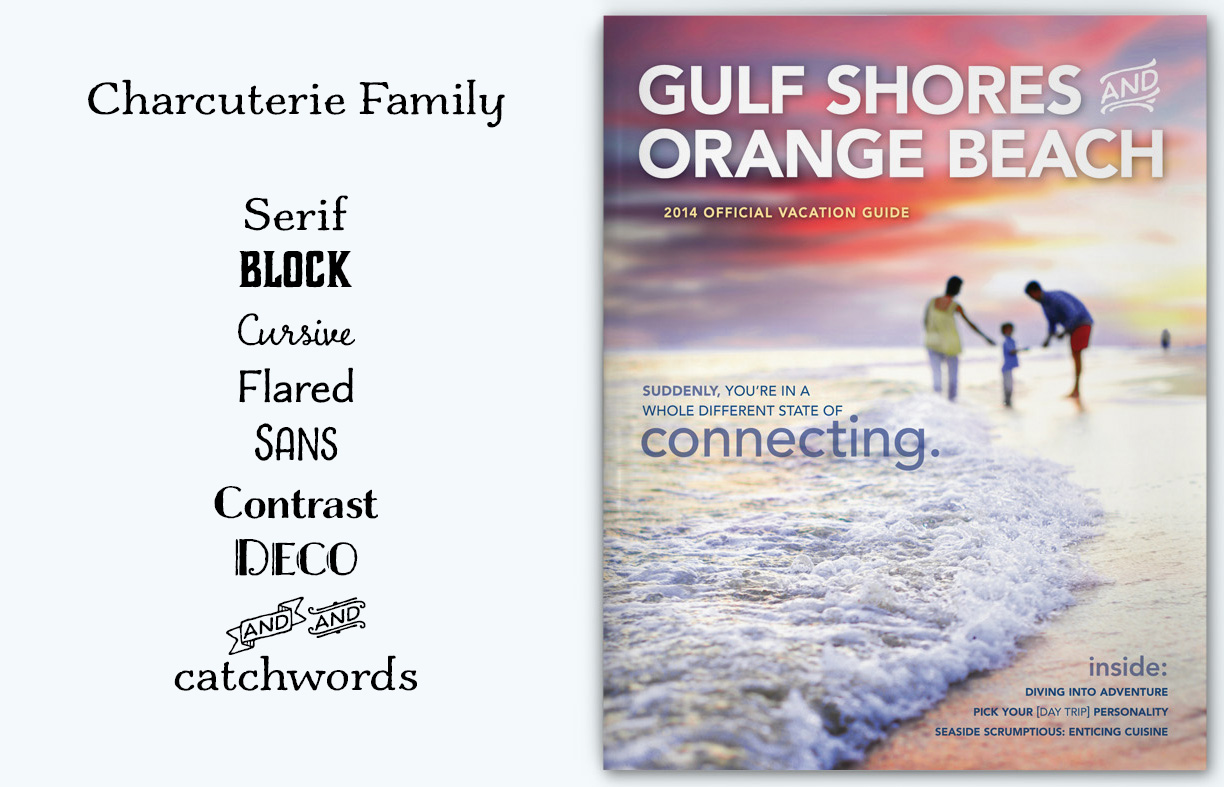 The example for today is the Charcuterie family, paired with Avenir, as used in the 2014 Official Gulf Shores & Orange Beach Guide. Font styles used are Charcuterie Serif, Charcuterie Block, Charcuterie Cursive, Charcuterie Flared, and Charcuterie Catchwords. It was an incredibly fun publication to design, and it still makes me happy to flip through it!