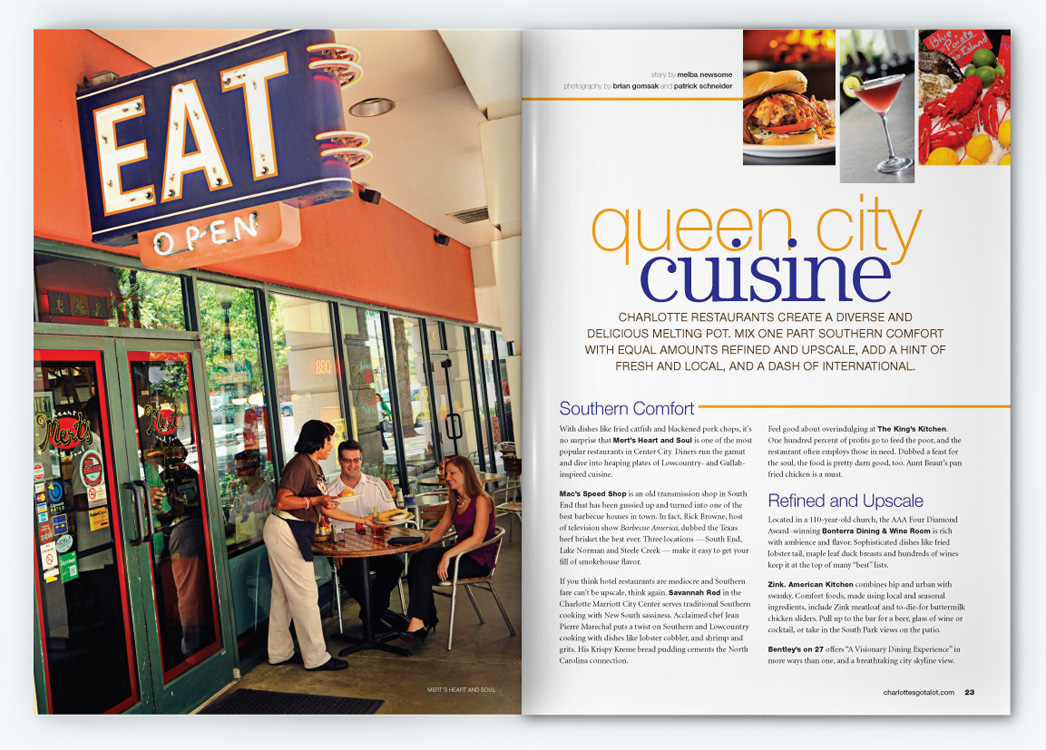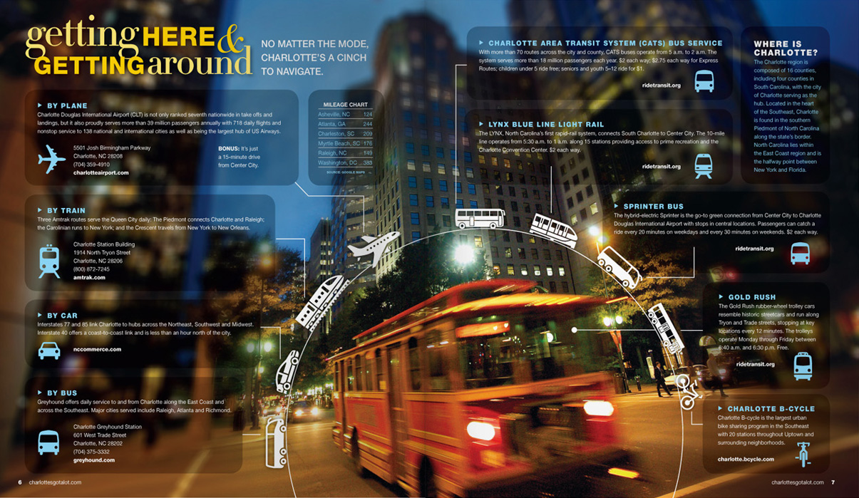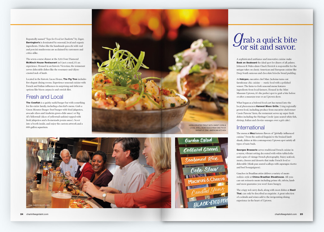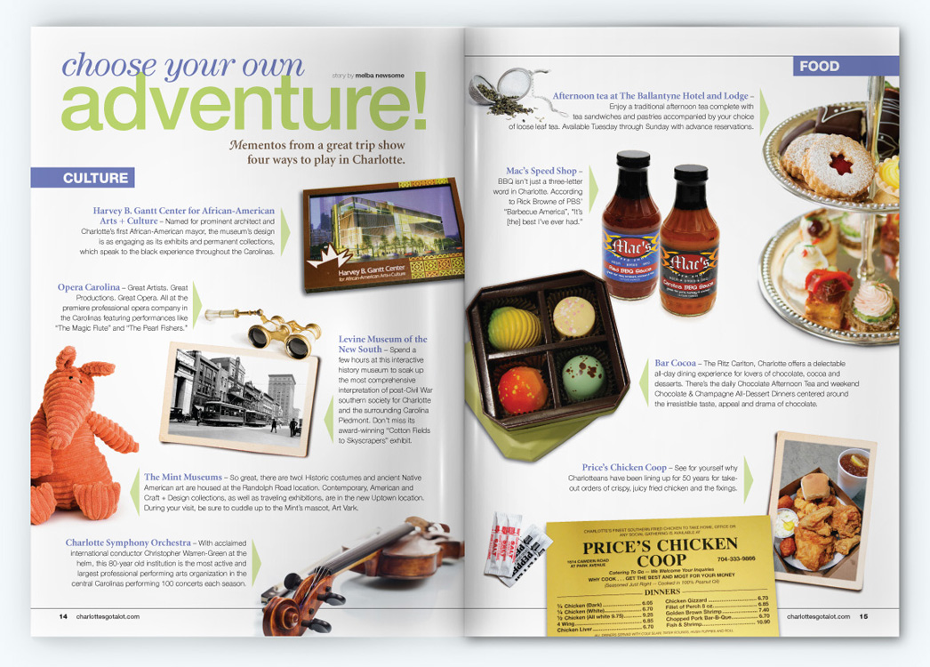 Sample pages from award-winning issues of the Official Charlotte NC Visitors Guide. CNJ Creative handled art direction and production design for 5 years, collaborating with with Charlotte Regional Visitors Authority, Pace Communications, RR Donnelly, and Quad Graphics.