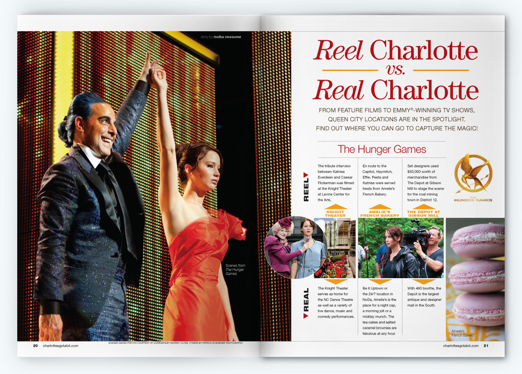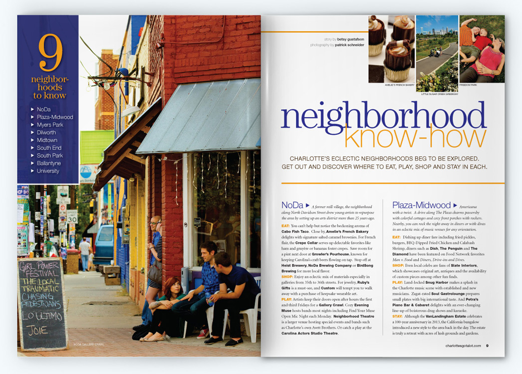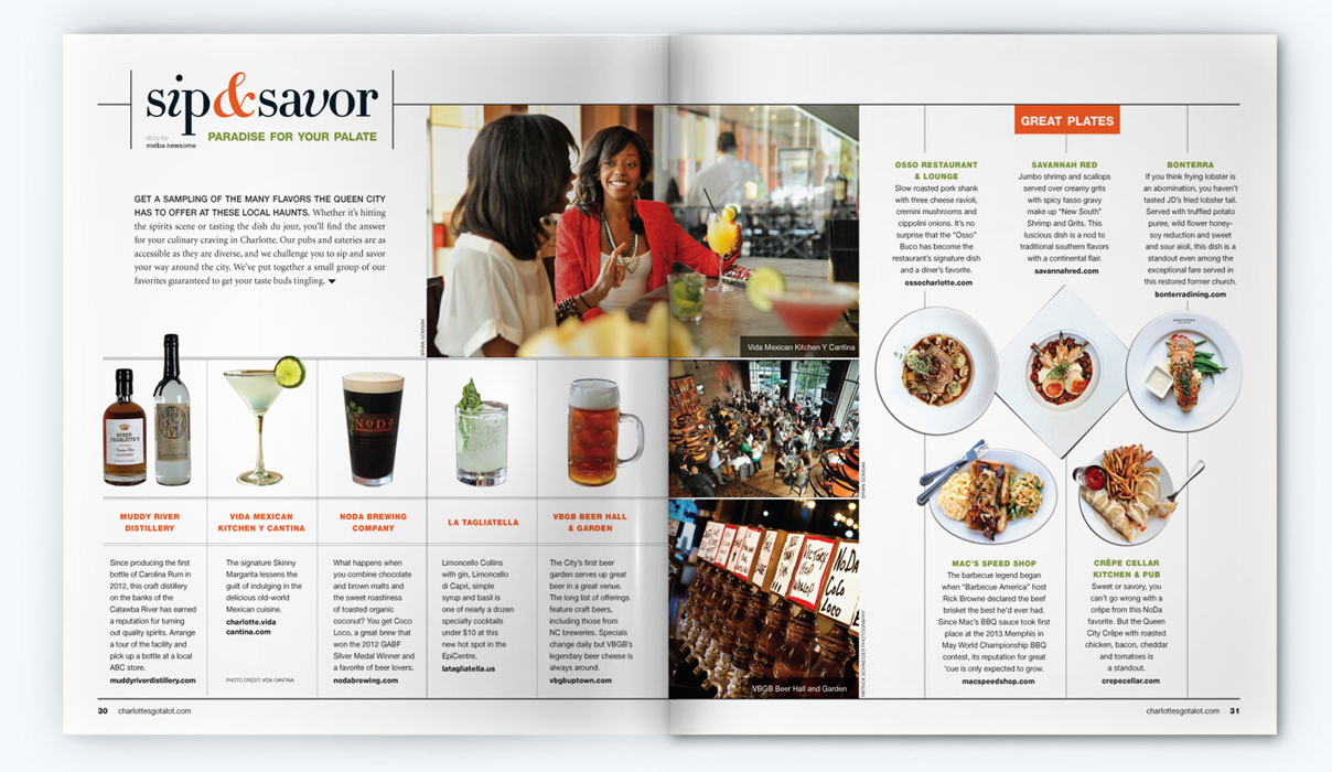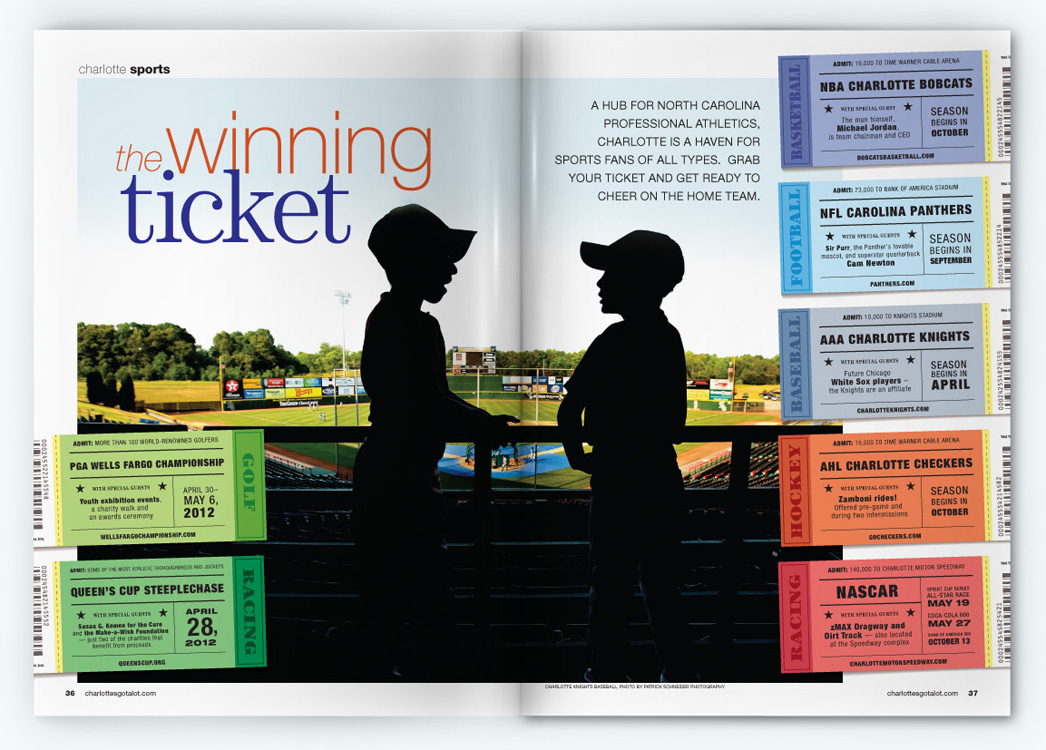 Sample pages from award-winning issues of the Official Charlotte NC Visitors Guide. CNJ Creative handled art direction and production design for 5 years, collaborating with with Charlotte Regional Visitors Authority, Pace Communications, RR Donnelly, and Quad Graphics.