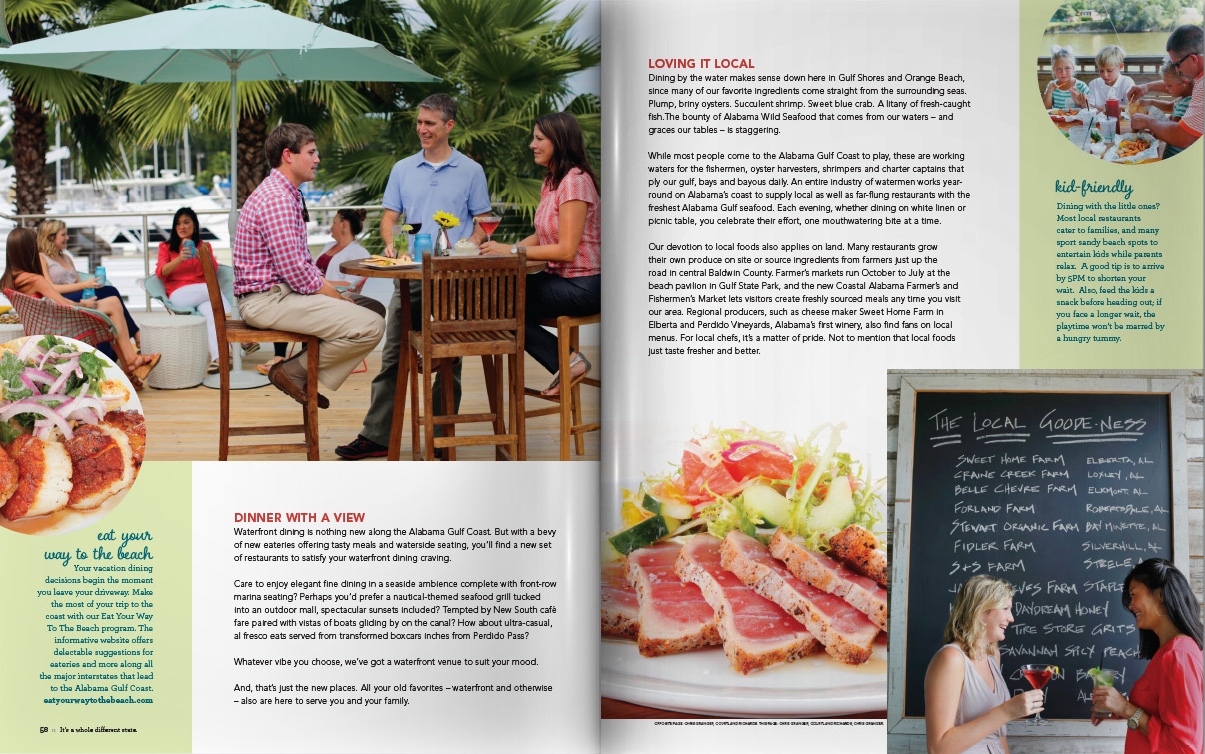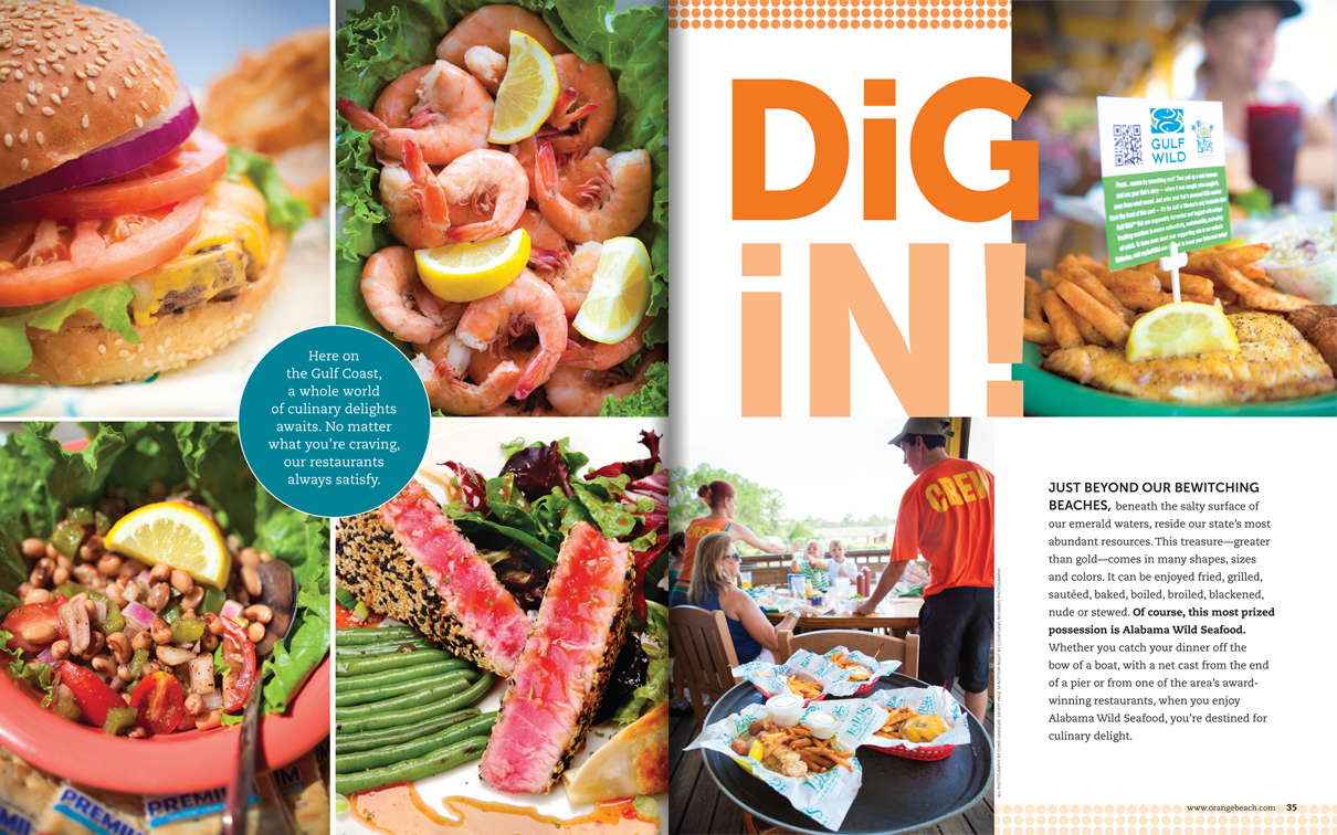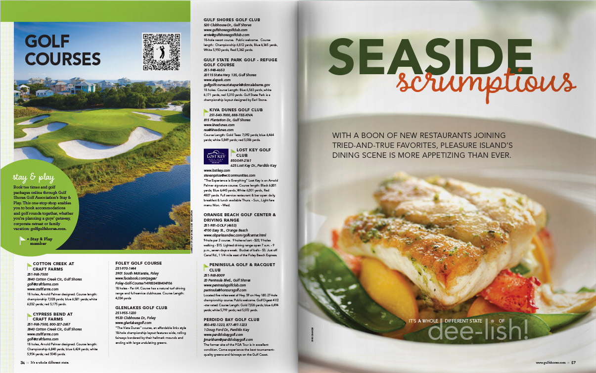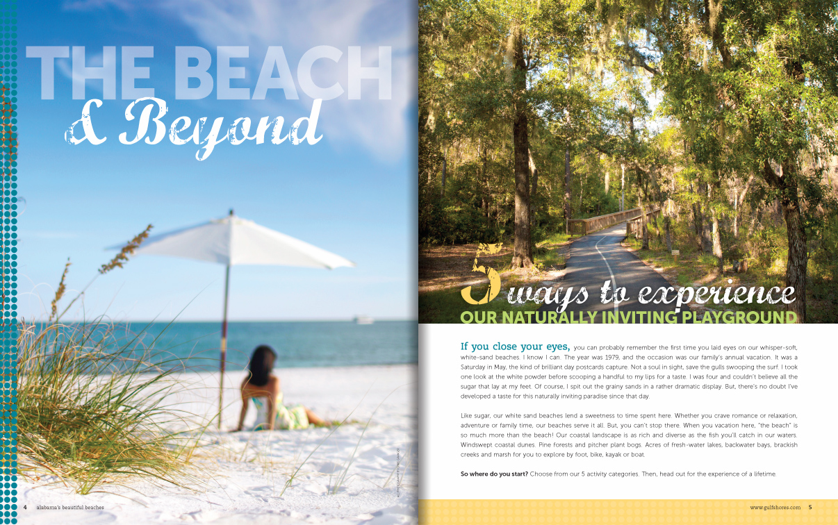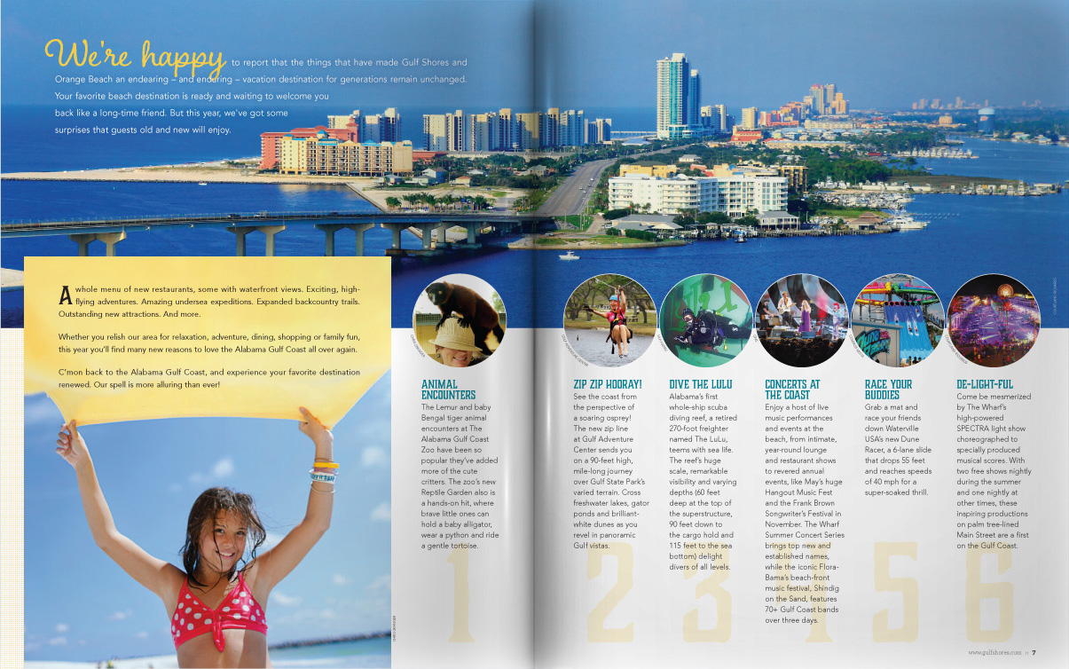 Sample pages from award-winning Gulf Shores and Orange Beach Vacation Guide issues. I served as art and photography director for 10 years, both directly as an employee and then through CNJ Creative.