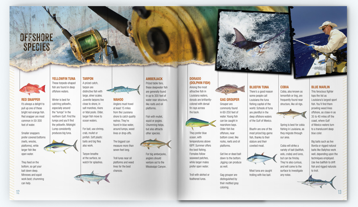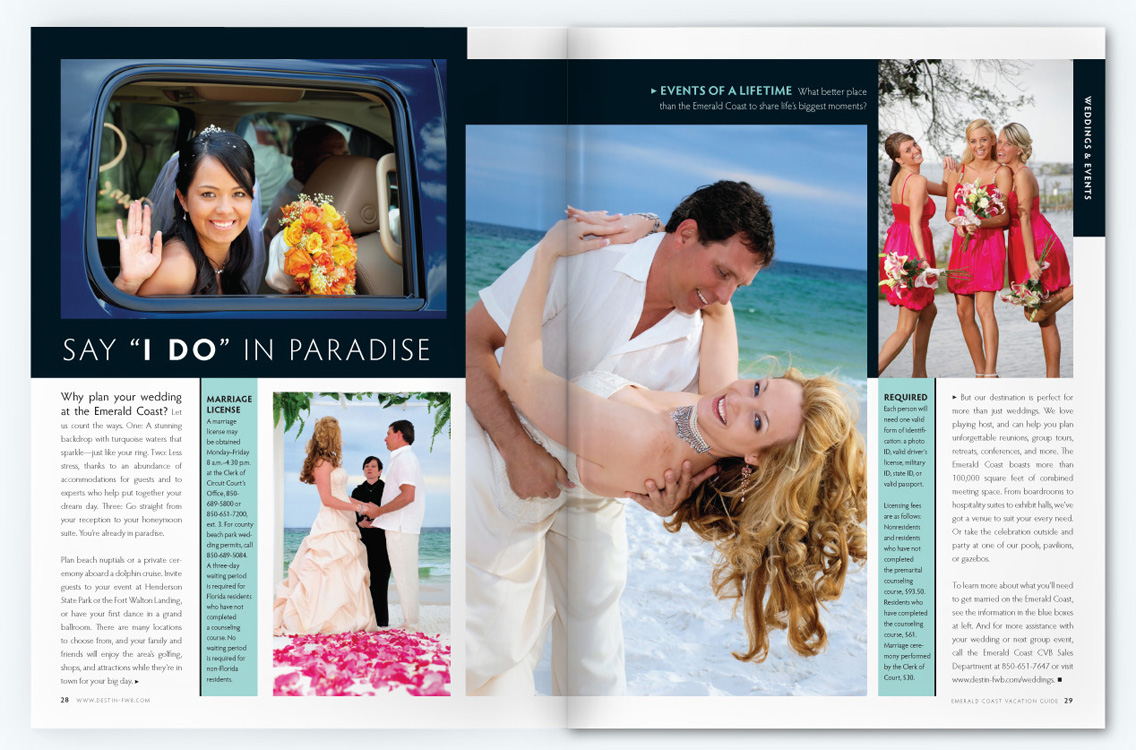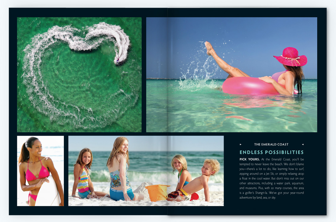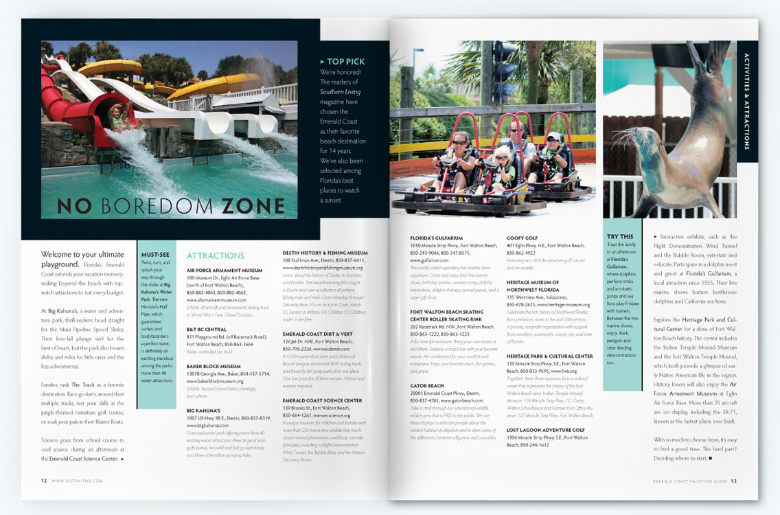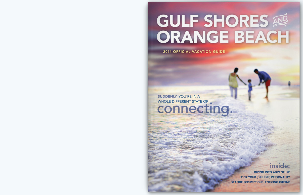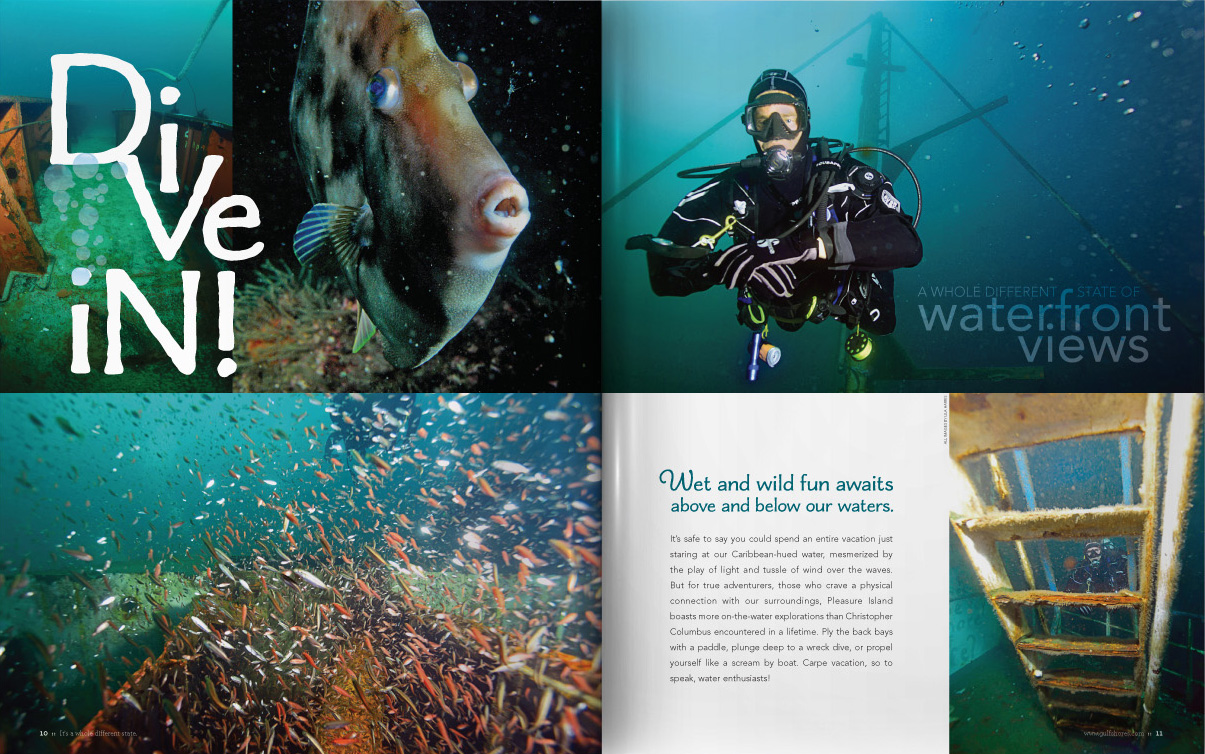 Sample pages from award-winning Gulf Shores and Orange Beach Vacation Guide issues. I served as art and photography director for 10 years, both directly as an employee and then through CNJ Creative.