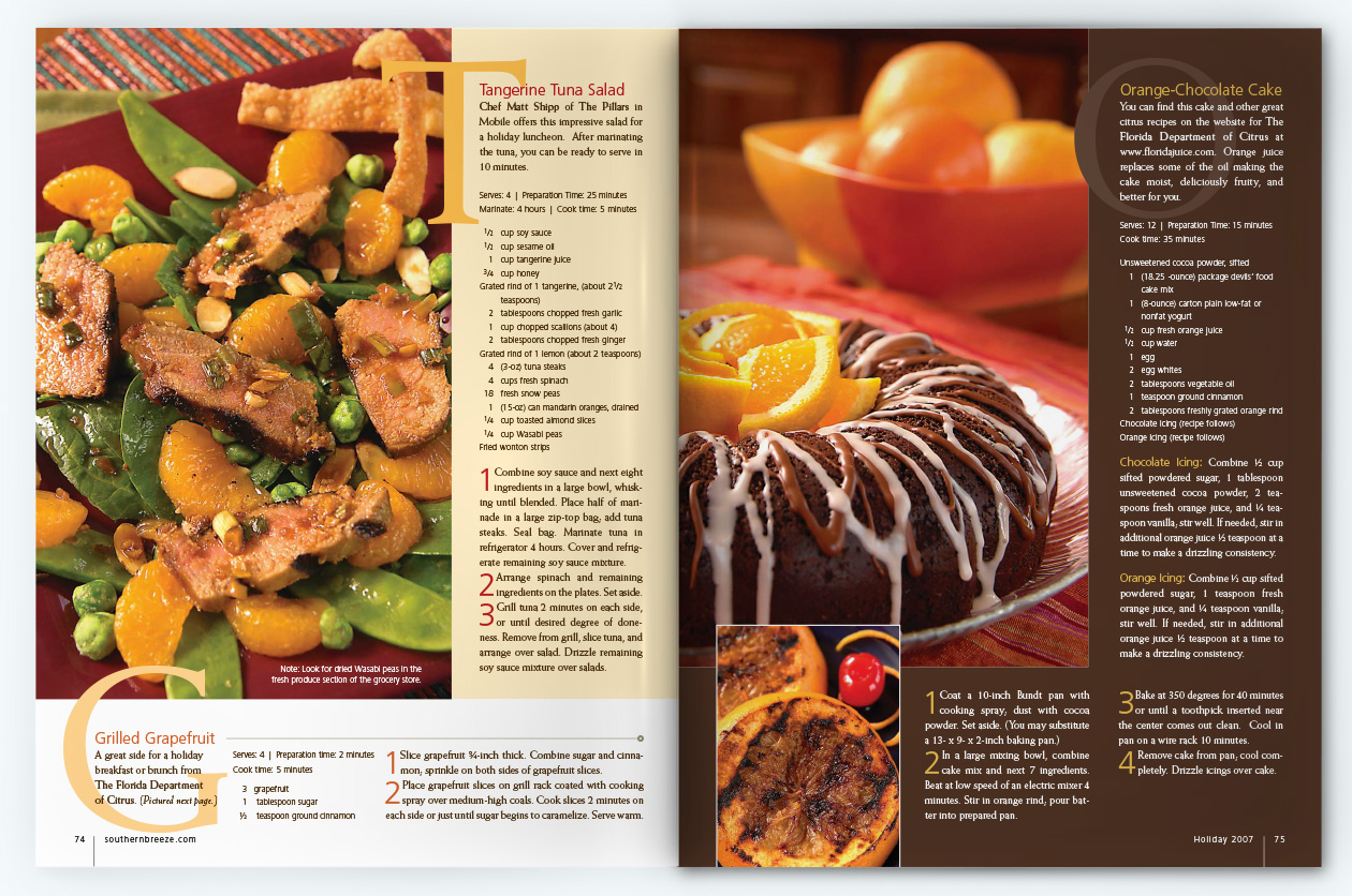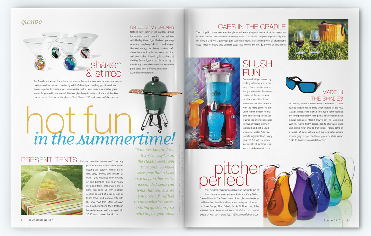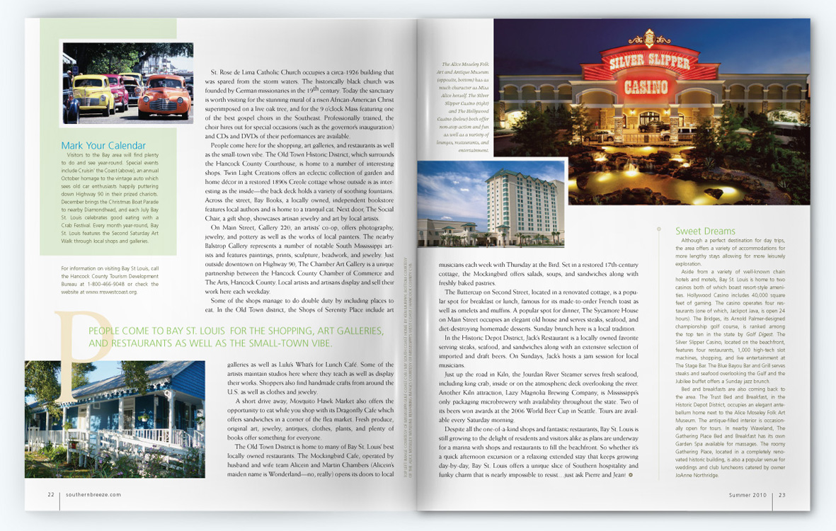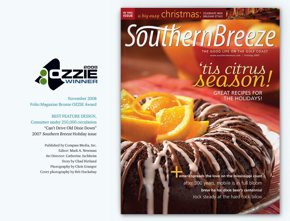 Southern Breeze magazine was a glossy, award-winning quarterly publication which covered people, places, lifestyle, and the culinary scene along the Gulf Coast from Lake Charles, LA to Apalachicola, FL. I served as Senior Art Director while an employee for Compass Media from 2006-2009 and then Art Director as a contract designer from 2009-2010, handling everything from photoshoot scouting and assignments, paging, designing, proofing, and liaising with Publishers Press for printing.