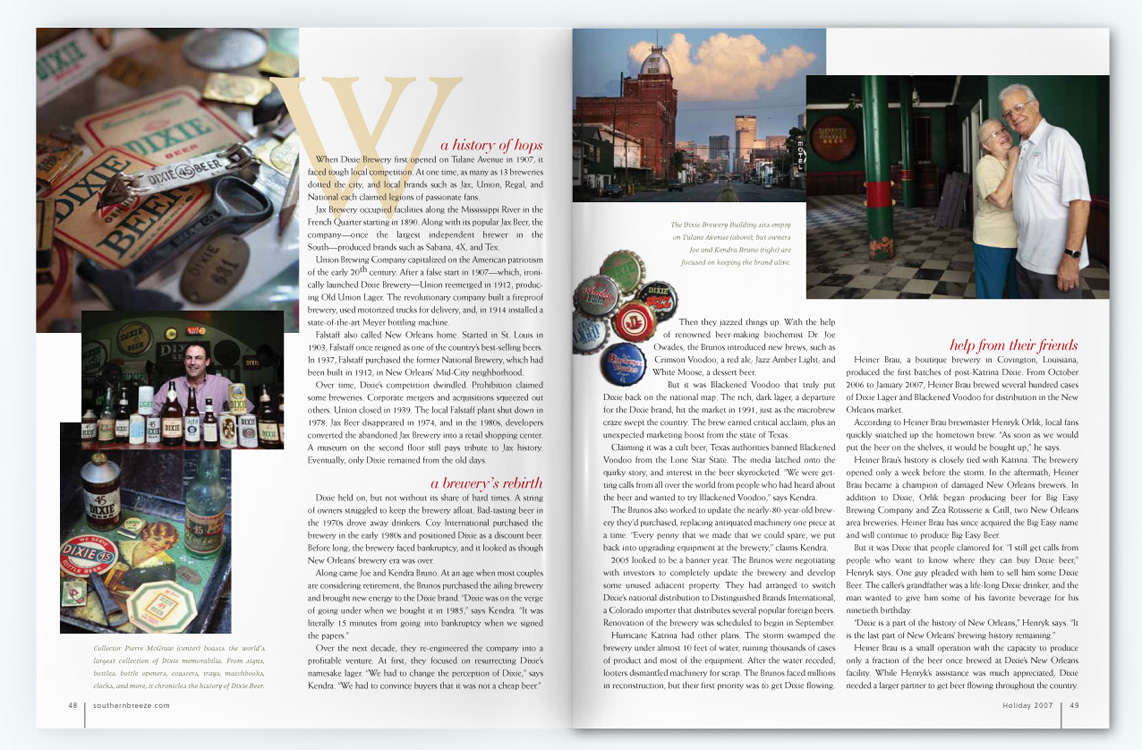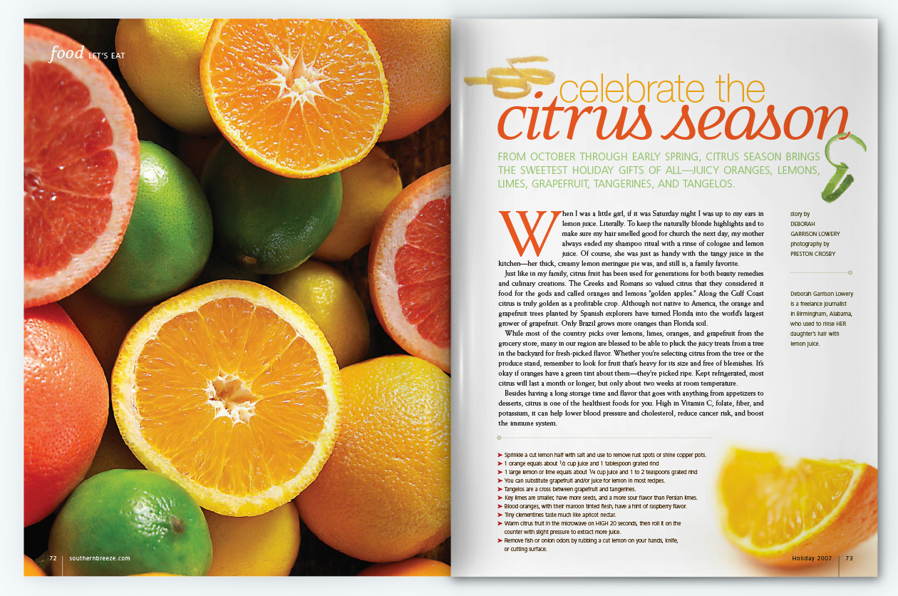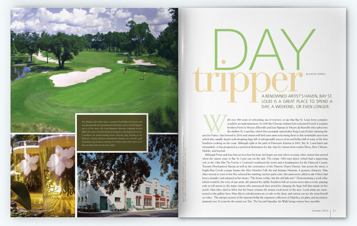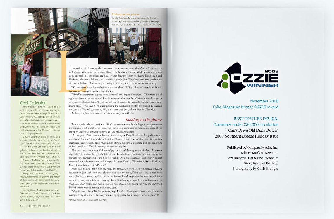 Southern Breeze magazine was a glossy, award-winning quarterly publication which covered people, places, lifestyle, and the culinary scene along the Gulf Coast from Lake Charles, LA to Apalachicola, FL. I served as Senior Art Director while an employee for Compass Media from 2006-2009 and then Art Director as a contract designer from 2009-2010, handling everything from photoshoot scouting and assignments, paging, designing, proofing, and liaising with Publishers Press for printing.