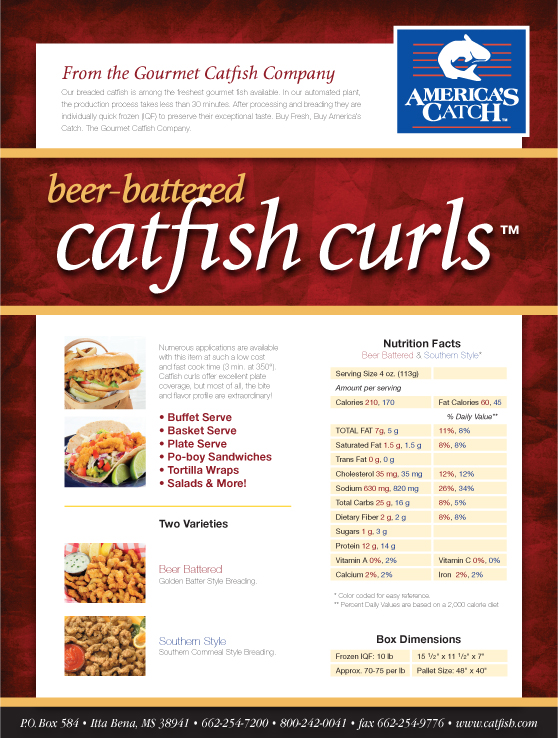 America’s Catch 25th Anniversary branding and original photography styling and art direction and design for Catfish Curls sales sheet.